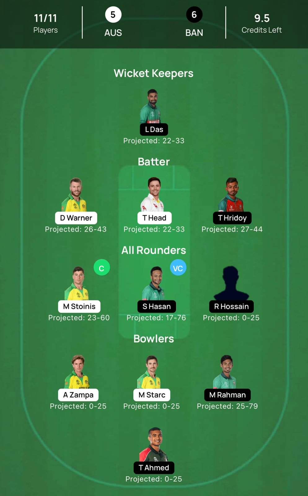 Marcus Stoinis: Arguably the player of this T20WC 2024 so far. Stoinis has scored 156 runs at an average of 78.00 and a strike rate of 190.24 while taking 6 wickets at an average of 8.66 and an economy of 5.77. He’s made a game-defining impact in three of Australia’s four games and pretty much single-handedly won the Kangaroos’ previous clash against Scotland, in which they were in deep trouble at one point. He’s amid a remarkable batting streak: six consecutive 25+ scores in T20WCs. Bangladesh will have its task cut out against that of the big Western Australian.