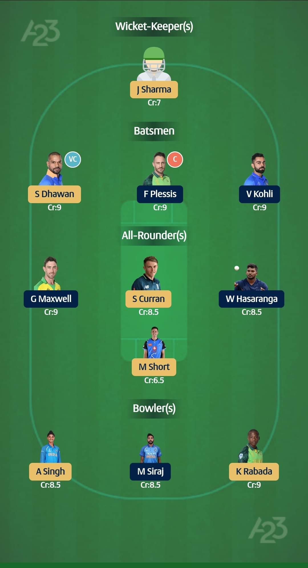Punjab Kings: Shikhar Dhawan (c), Prabsimran Singh/Atharva Taide, Matthew Short, Harpreet Singh Bhatia, Sikandar Raza, Jitesh Sharma, Shahrukh Khan, Sam Curran, Harpreet Brar, Kagiso Rabada, Arshdeep Singh
