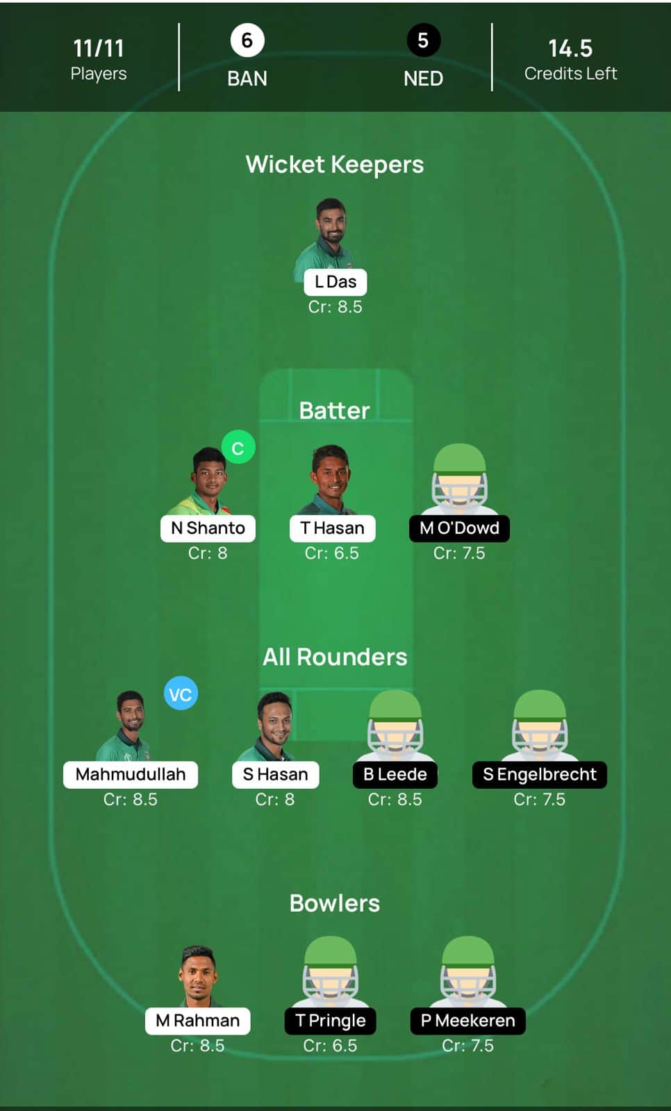Netherlands: Michael Levitt, Max ODowd, Vikramjit Singh, Sybrand Engelbrecht, Scott Edwards (c & wk), Bas de Leede, Teja Nidamanuru, Logan van Beek, Tim Pringle, Paul van Meekeren, Vivian Kingma