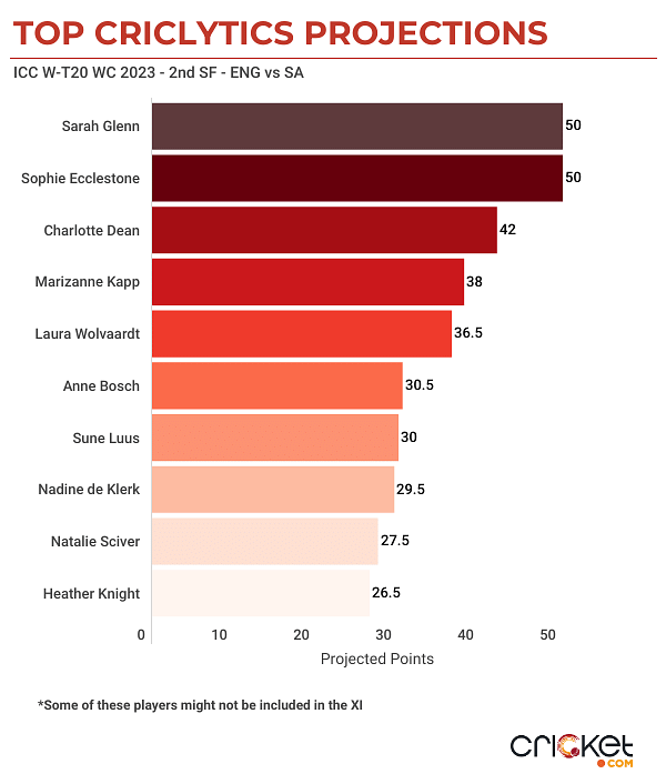 -Ecclestone in this edition has bagged eight wickets at an average of 7.6and a bowling strike rate of 12. She is the joint second-highest wicket taker in this WC. In four innings, she has two three-wicket hauls. Adding to that, against South Africa, she has a great record. In eight innings, she has 11 wickets at a bowling strike rate of 17.4.