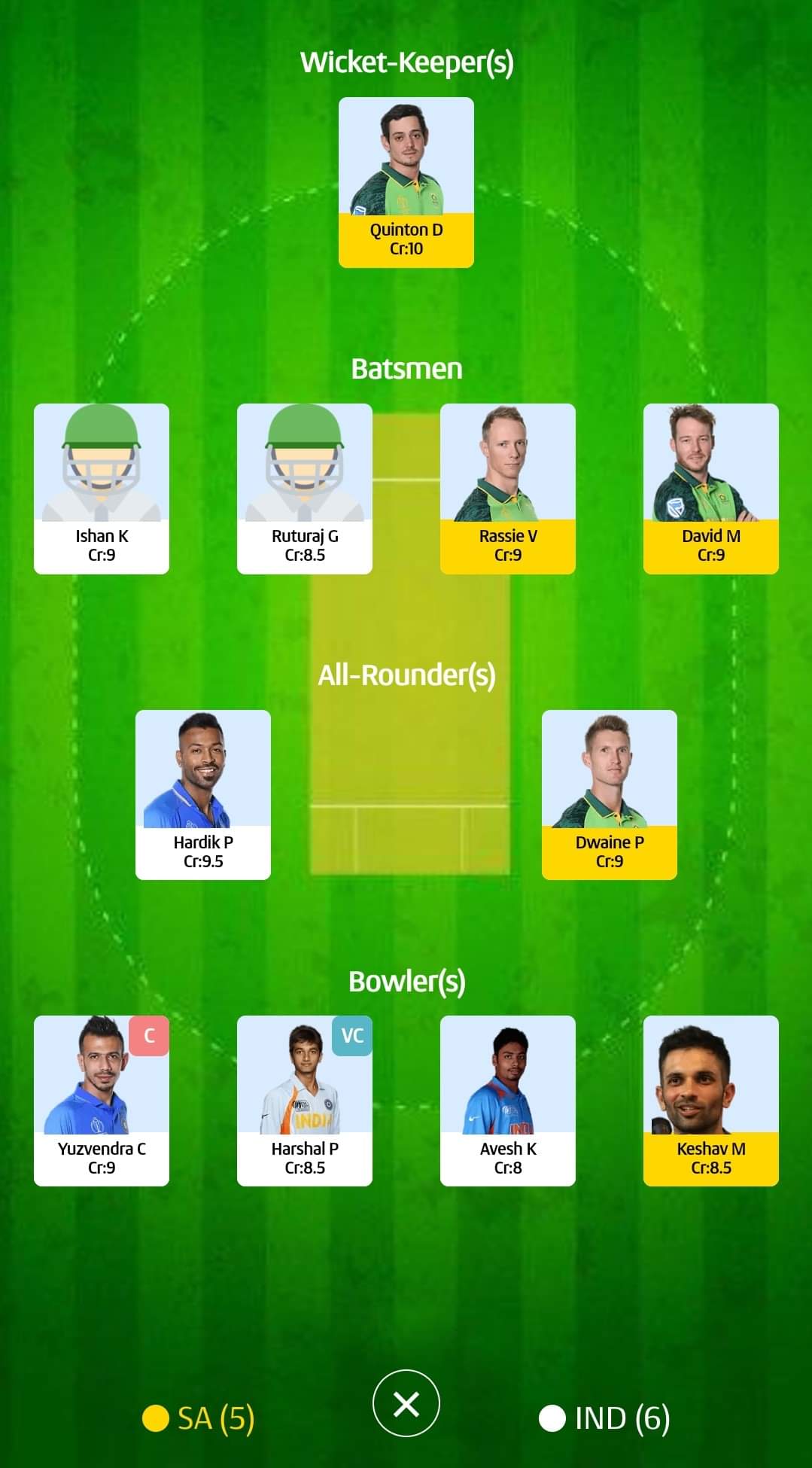For Grand leagues: Quinton de Kock (Captain), Ishan Kishan (Vice-captain)