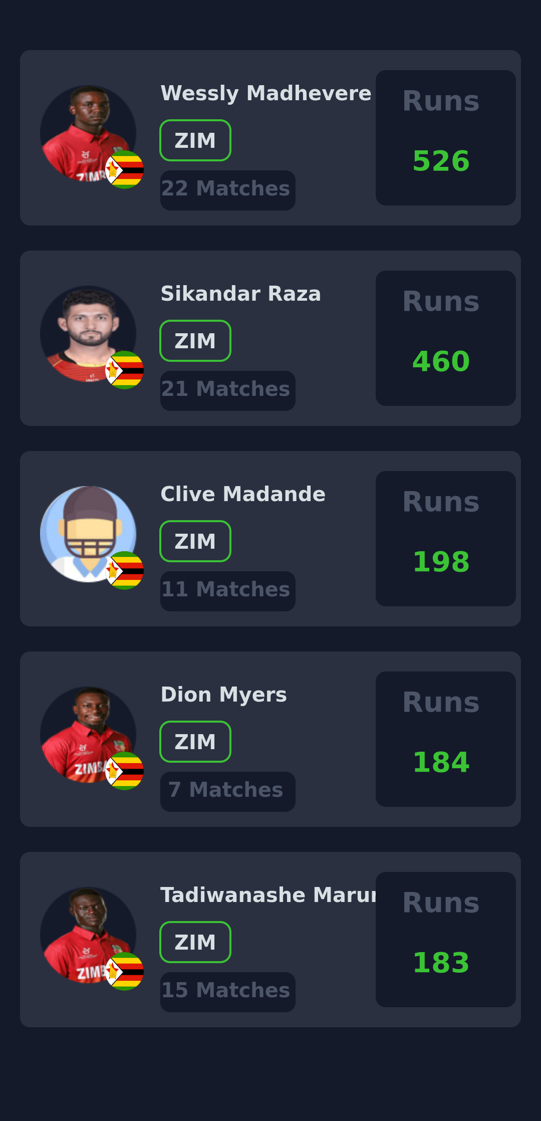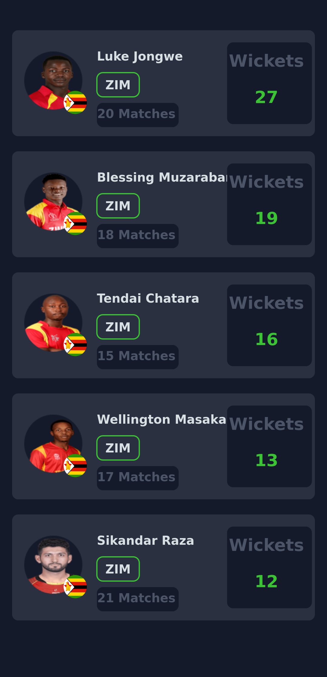Zimbabwe: Tendai Chatara, Sikandar Raza ( c ), Richard Ngarava, Wessly Madhevere, Dion Myers, Johnathan Campbell, Faraz Akram, Blessing Muzarabani, Tadiwanashe Marumani, Clive Madande (wk), Brian Bennett