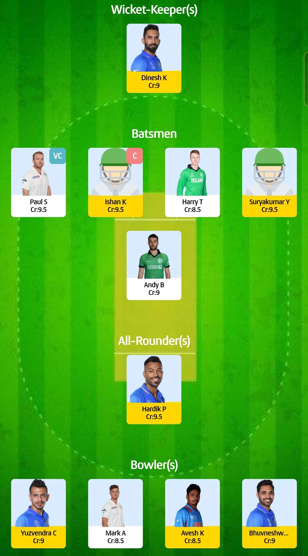 For Grand leagues: Paul Stirling ©, Bhuvneshwar Kumar (vc)