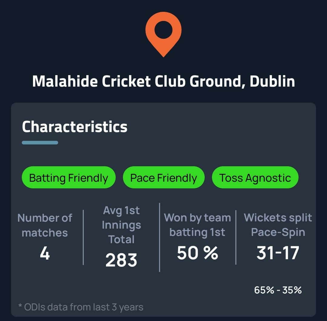 The Village Malahide has hosted 20 ODI matches in their history in which batters have scored at an average of 35 runs per wicket. If the India T20Is and the first ODI on Sunday were anything to go by, then there are reasons to believe that a lot of runs were on offer in the second game as well. In 20 matches, the average first batting score is 258 but the average winning score batting score rises to 325. Hence, it is always advisable to chase here, and that trend should continue.
