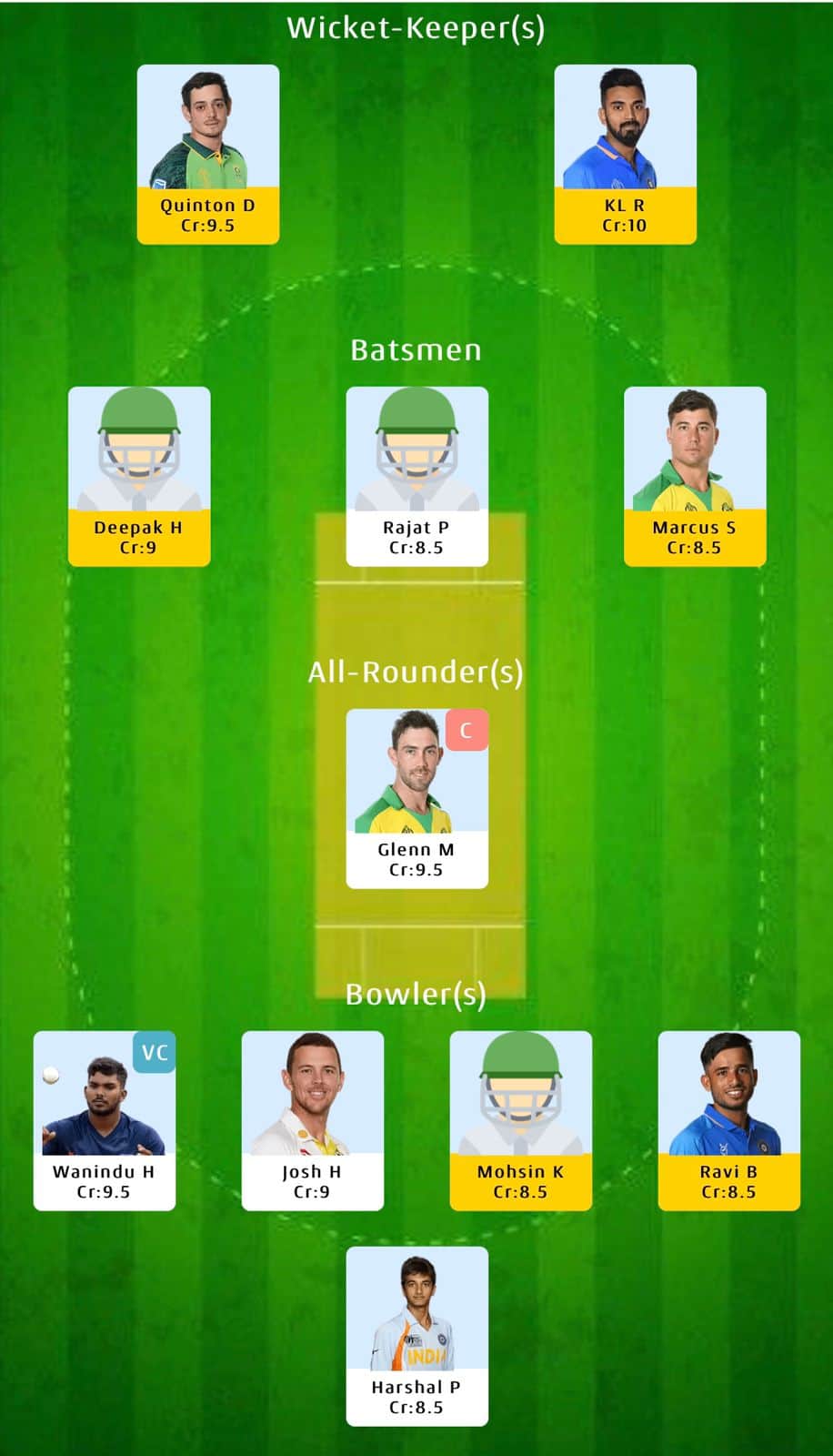 RCB: Virat Kohli, Faf du Plessis (c), Rajat Patidar, Glenn Maxwell, Mahipal Lomror, Dinesh Karthik (wk), Shahbaz Ahmed, Wanindu Hasaranga, Harshal Patel, Mohammed Siraj, Josh Hazlewood