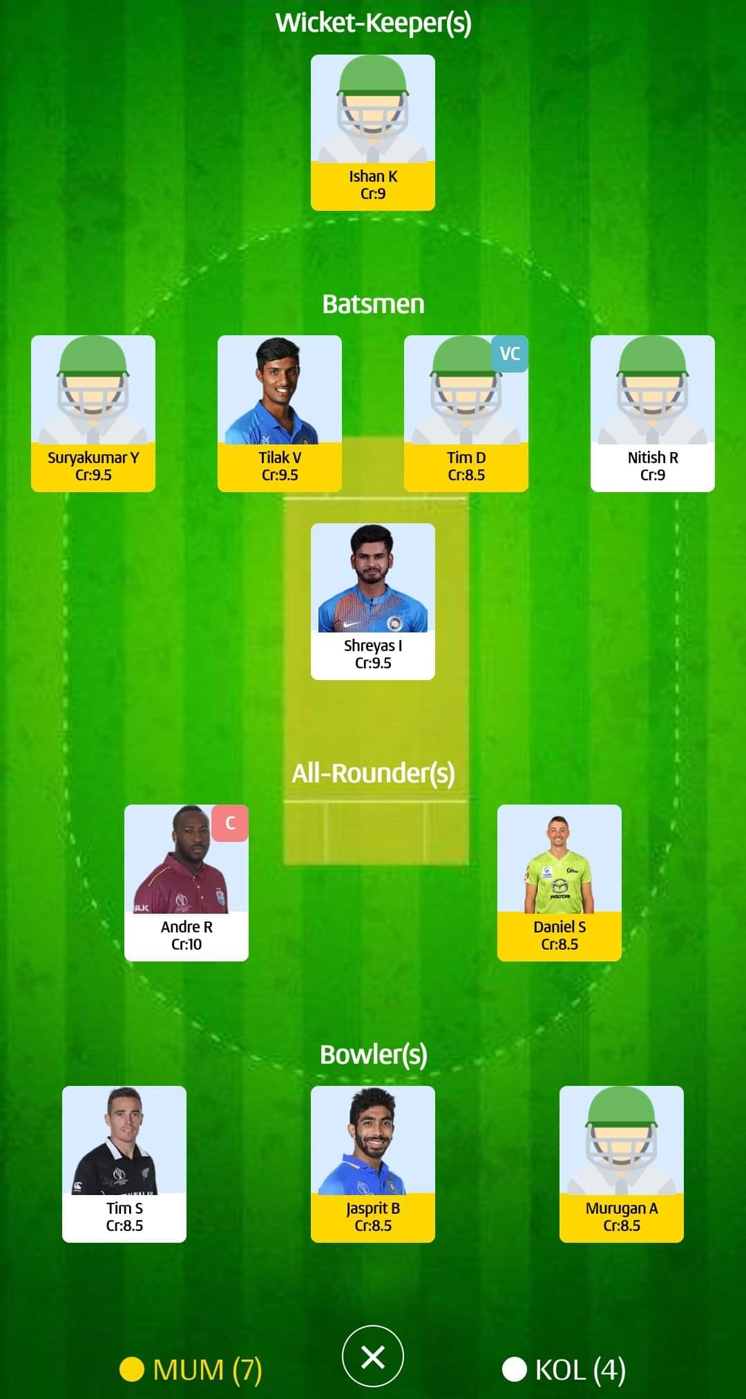 Mumbai Indians: Rohit Sharma (c), Ishan Kishan (wk), Tilak Varma, Suryakumar Yadav, Kieron Pollard, Tim David, Daniel Sams, Murugan Ashwin, Kumar Kartikeya, Riley Meredith, Jasprit Bumrah