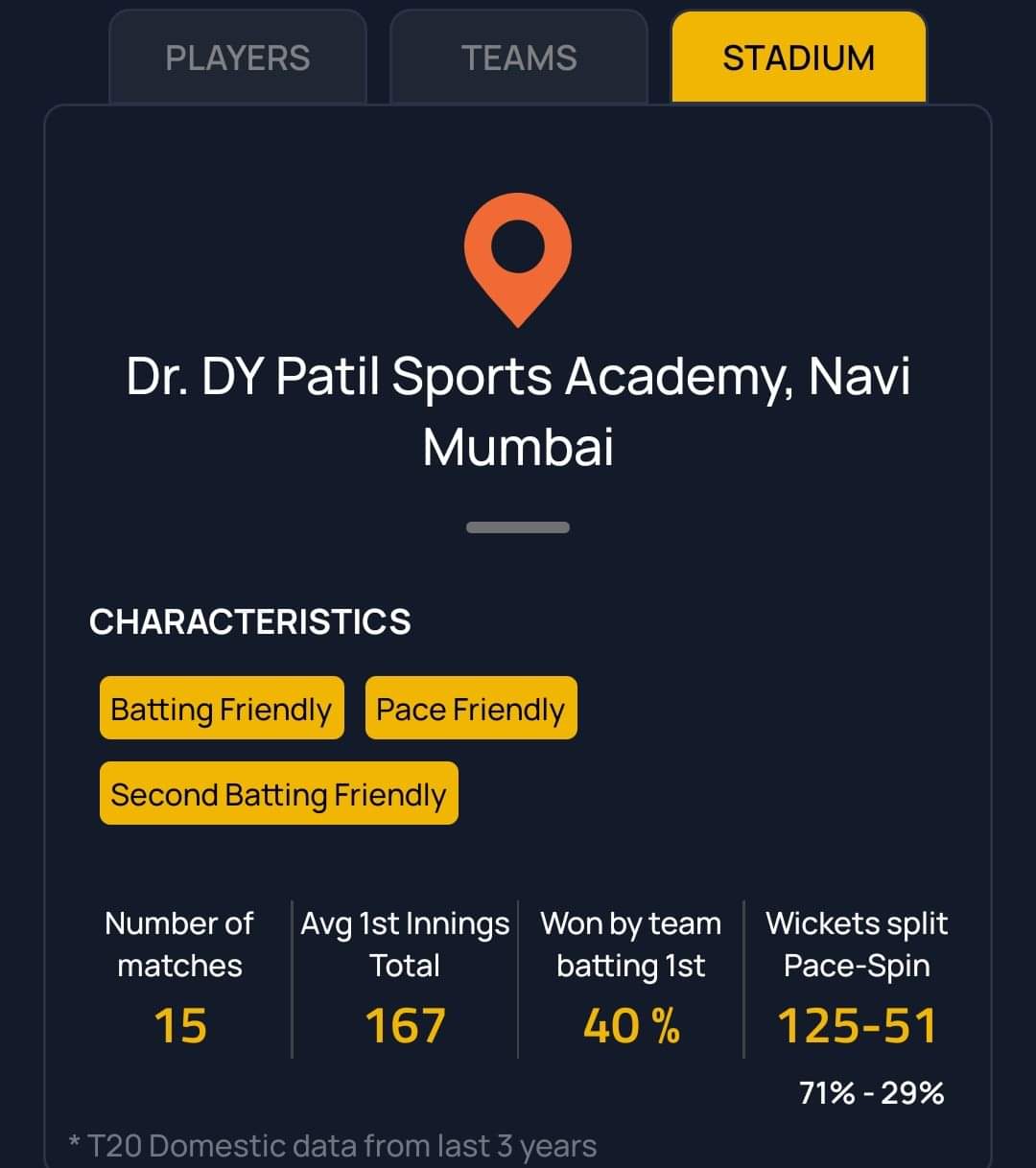The Dr DY Patil Sports Academy has hosted 15 games so far this season. The average run-rate of 8.4 is the joint lowest among the four venues. The batters here have scored runs at an average of 26.5, while a wicket has fallen every 19 deliveries. The fast bowlers here have a strike rate of 18.6, while the spinners have taken a wicket every 23.6 deliveries.
