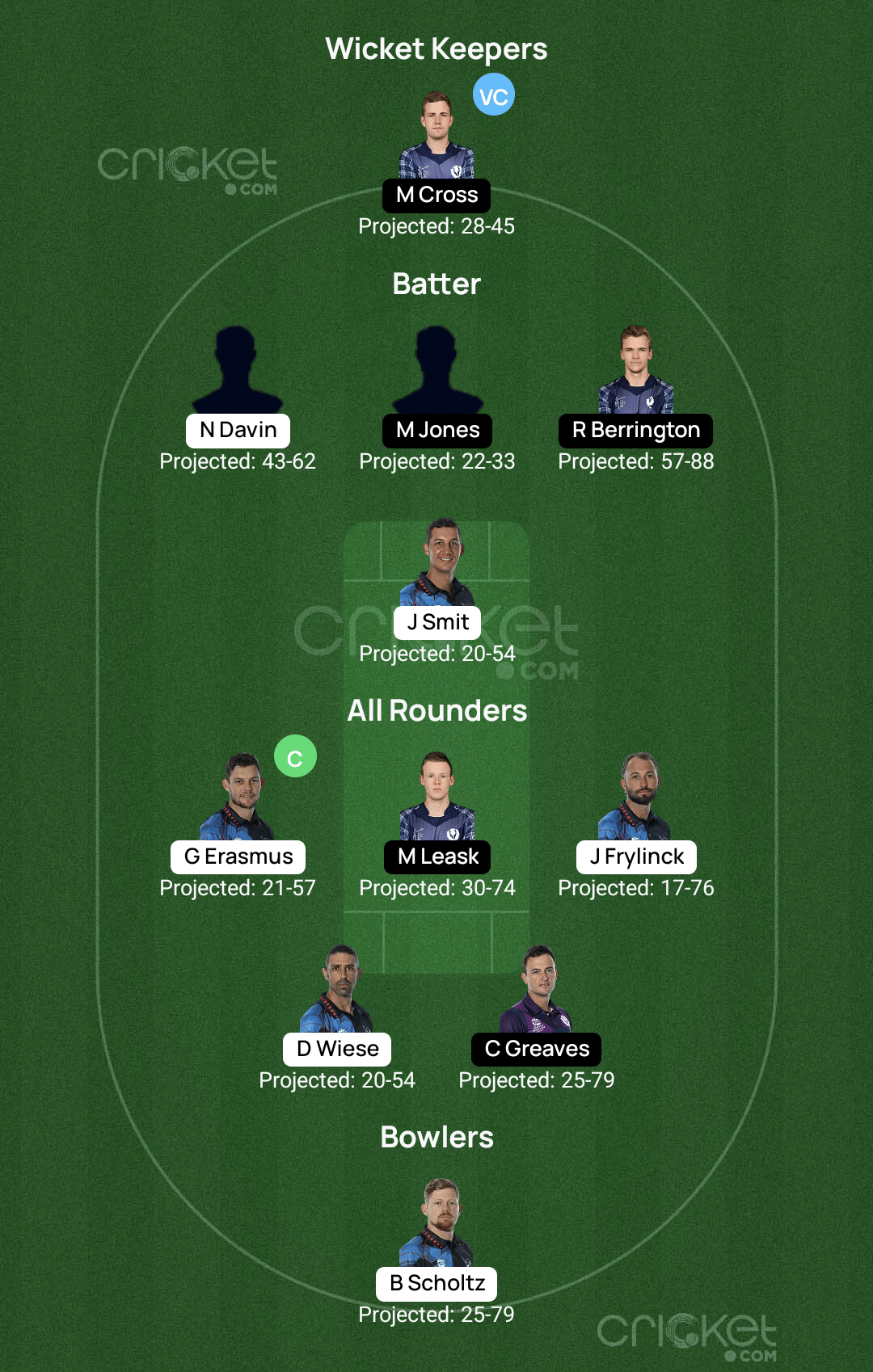 David Wiese - The 39-year-old has arguably been Namibia’s most important player in the last couple of years. Against Oman, the fast-bowling all-rounder claimed three wickets before single-handedly winning Namibia the game in the Super Over. He first hit a four and a six in the first two deliveries and then defended 21 with the ball. He is one player who could fetch you points in all three departments.