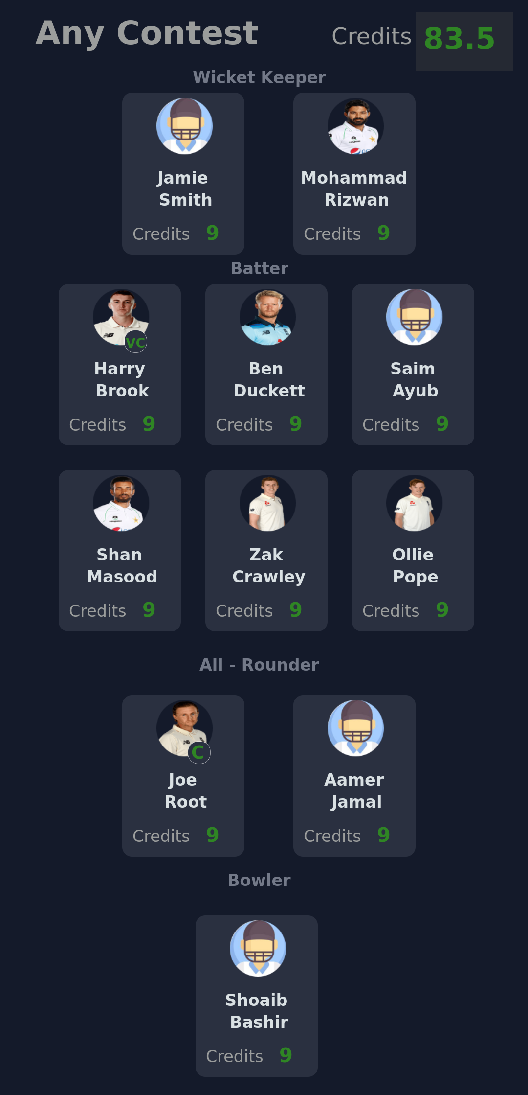 England: Zak Crawley, Ben Duckett, Ollie Pope, Joe Root, Harry Brook, Ben Stokes ( c ), Jamie Smith (wk), Brydon Carse, Matthew Potts, Jack Leach, Shoaib Bashir