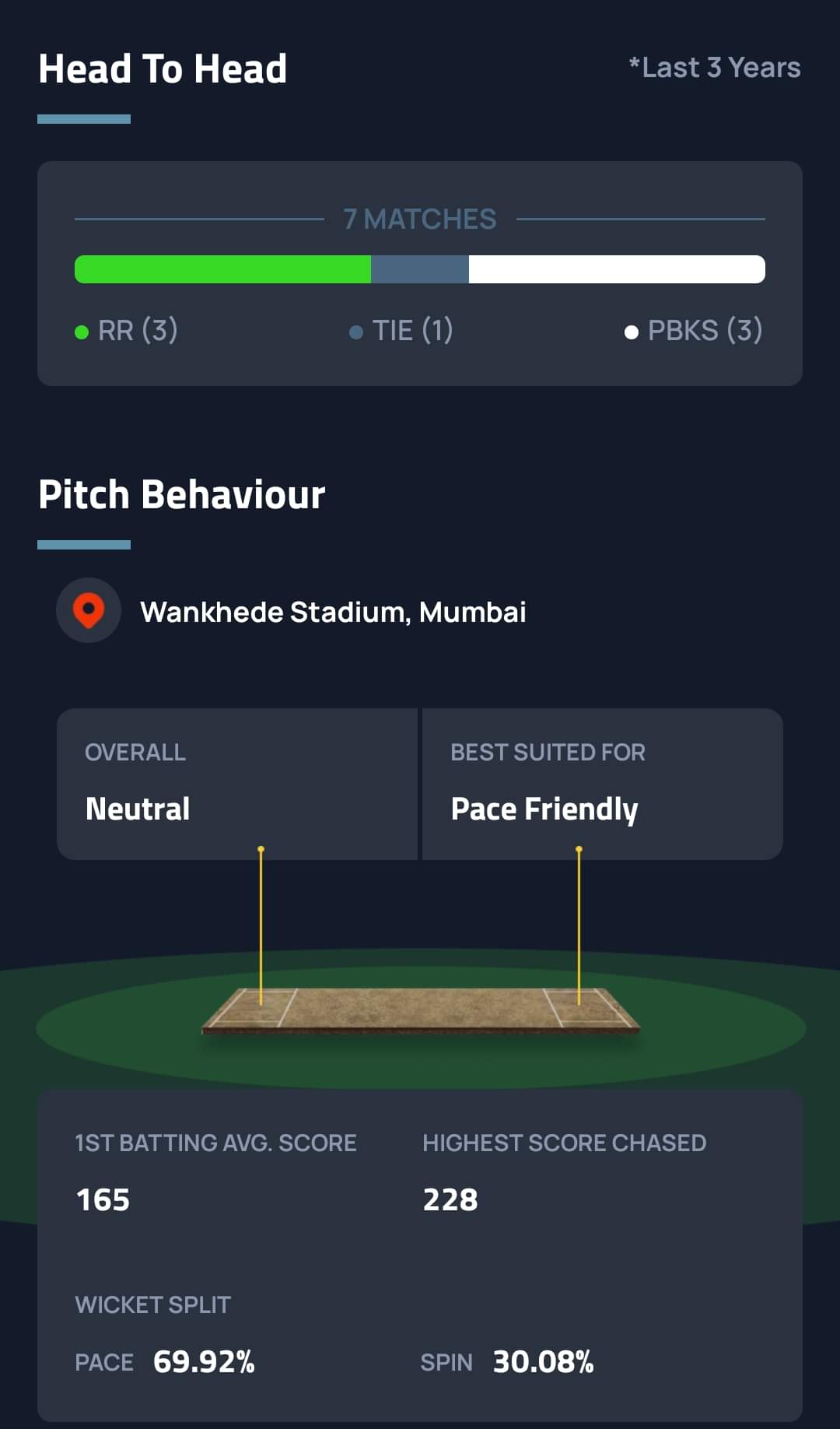 Last 5 matches: RR 3 wins | PBKS 2 wins