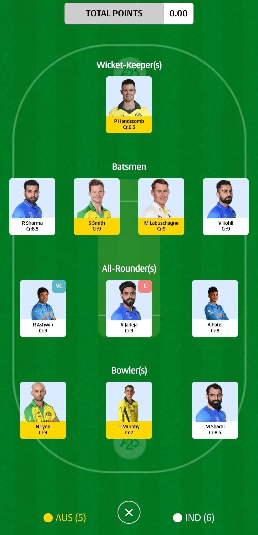 For grand league: Axar Patel (capt), Steve Smith (vice-capt)