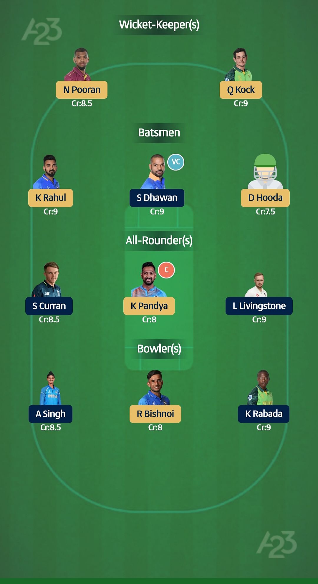 For grand league: Nicholas Pooran (capt), Ravi Bishnoi (vice-capt)