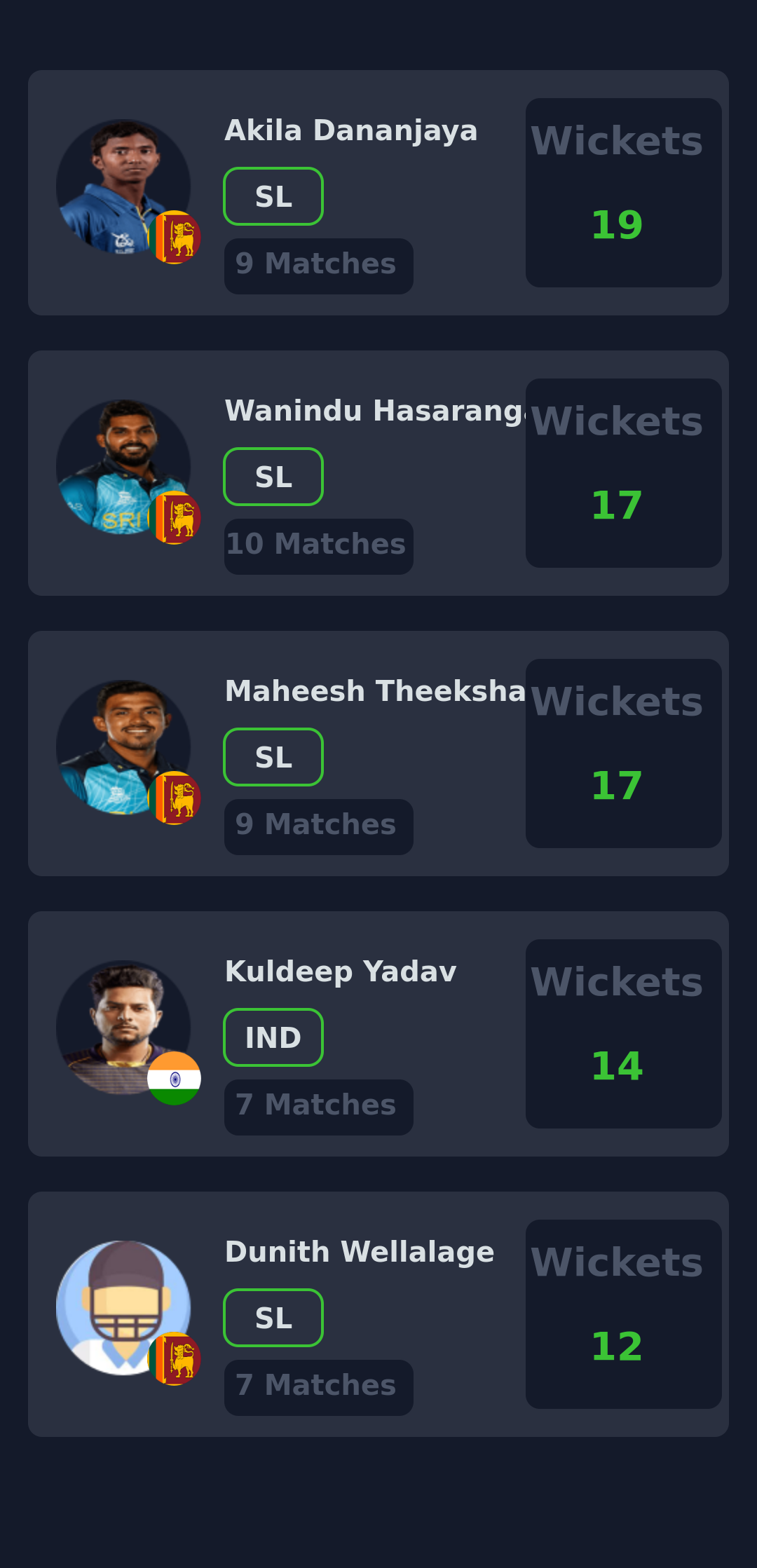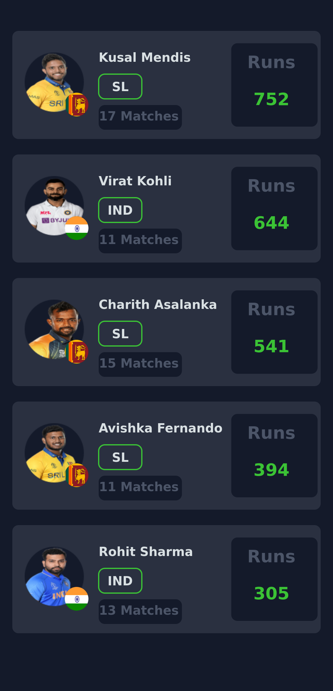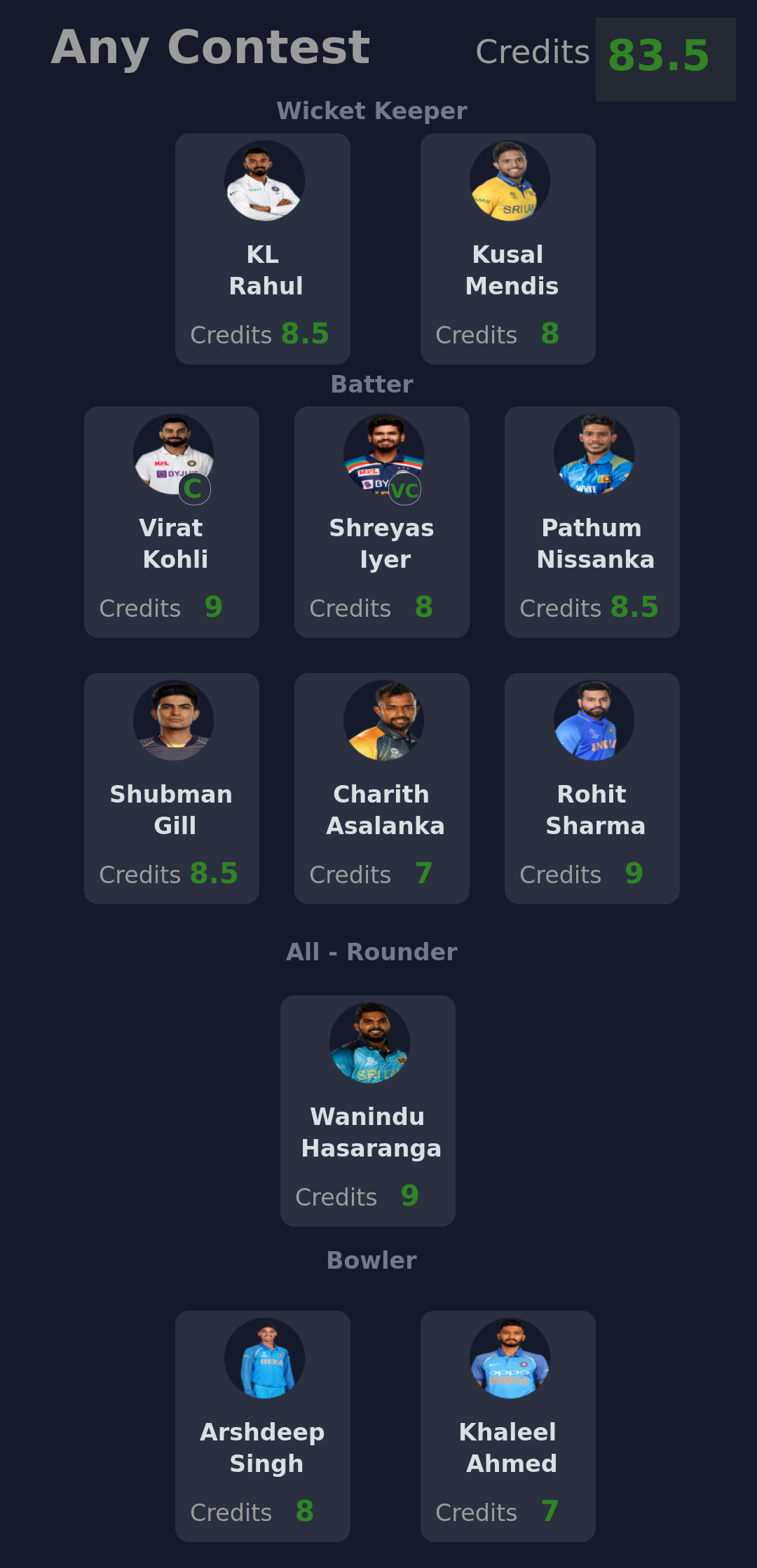 Sri Lanka: Pathum Nissanka, Kusal Mendis, Avishka Fernando, Sadeera Samarawickrama, Charith Asalanka, Kamindu Mendis, Wanindu Hasaranga, Matheesha Pathirana, Dilshan Madushanka, Maheesh Theekshana, Asitha Fernando