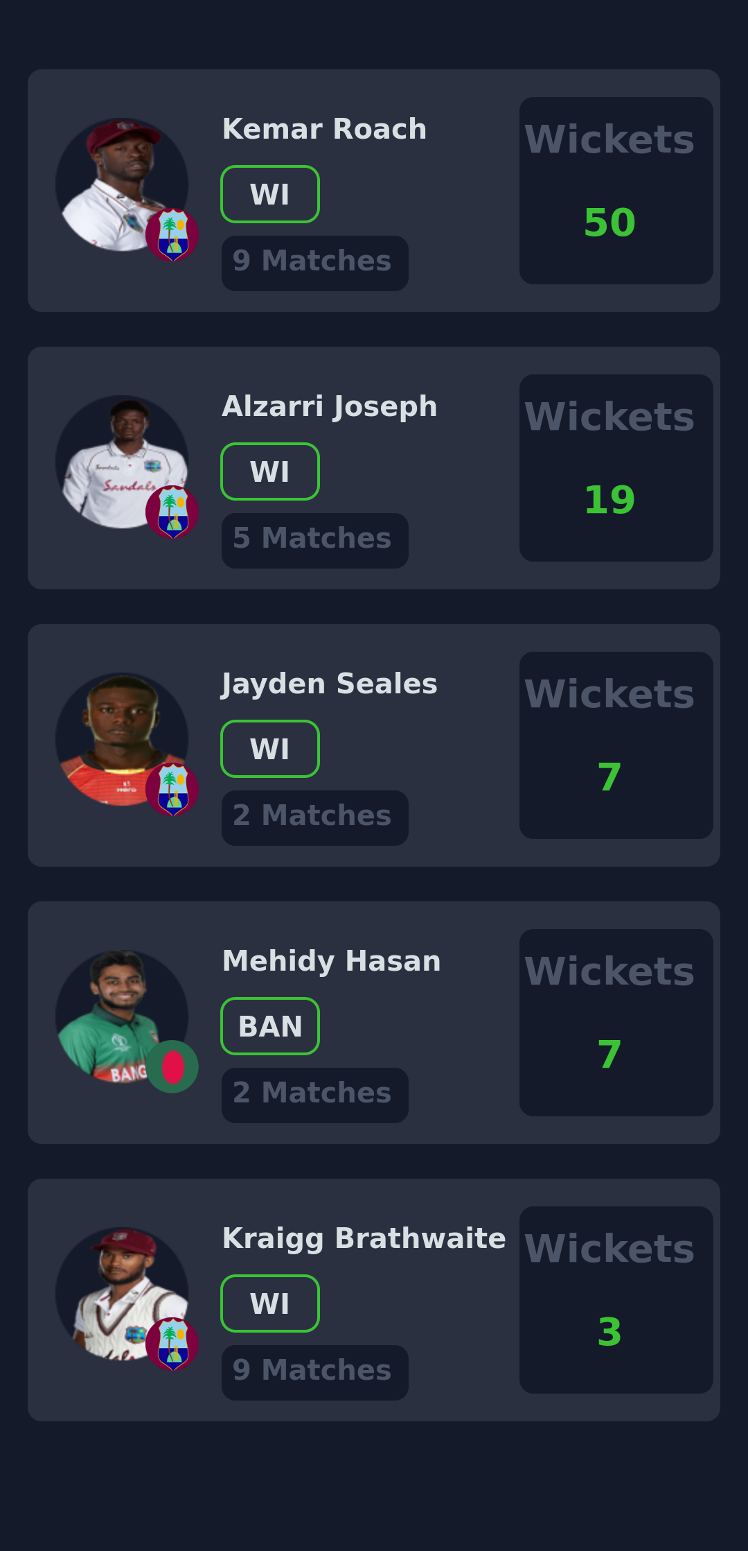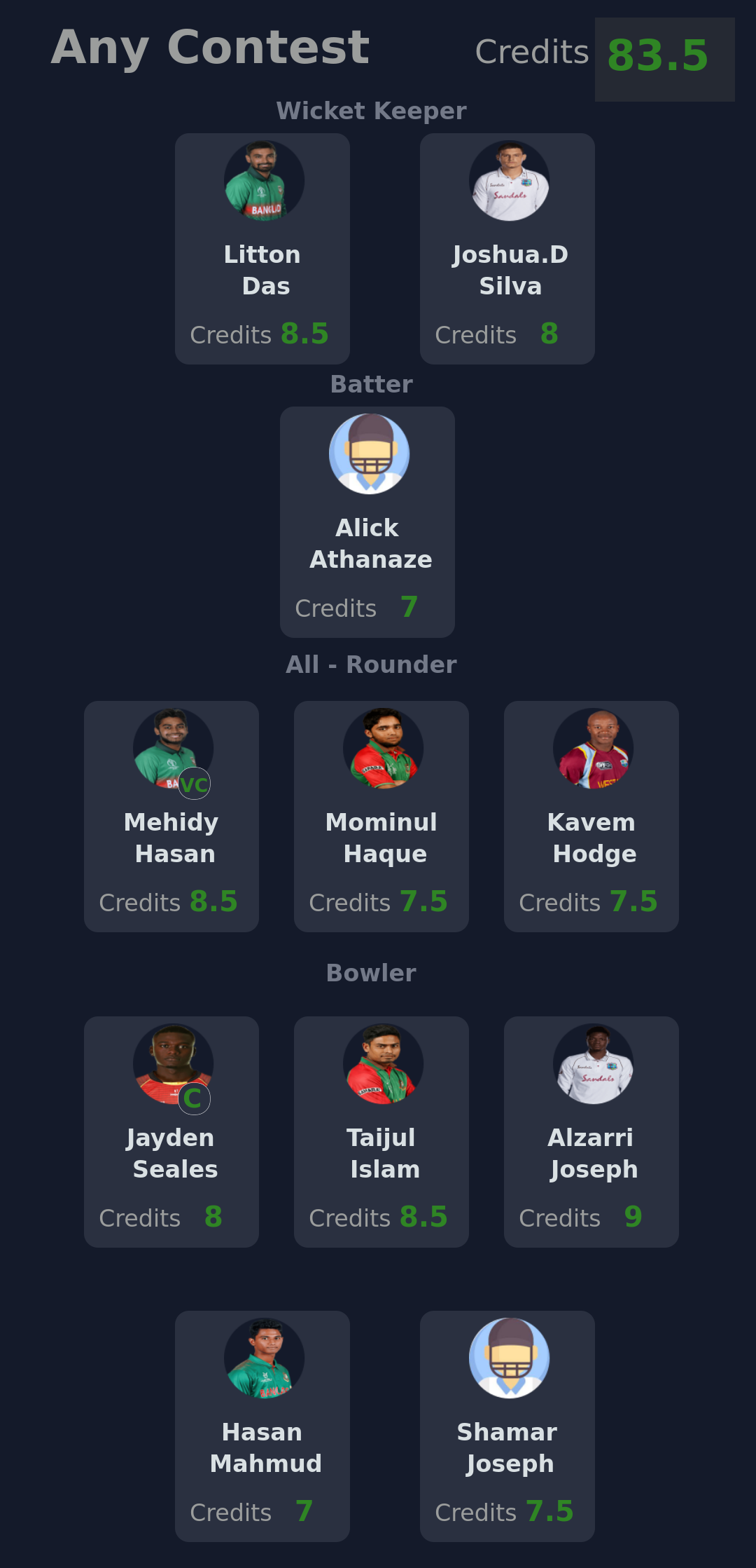 West Indies: Kraigg Brathwaite, Mikyle Louis, Keacy Carty, Alick Athanaze, Kavem Hodge, Justin Greaves, Joshua Da Silva, Alzarri Joseph, Jomel Warrican, Jayden Seales, Shamar Joseph