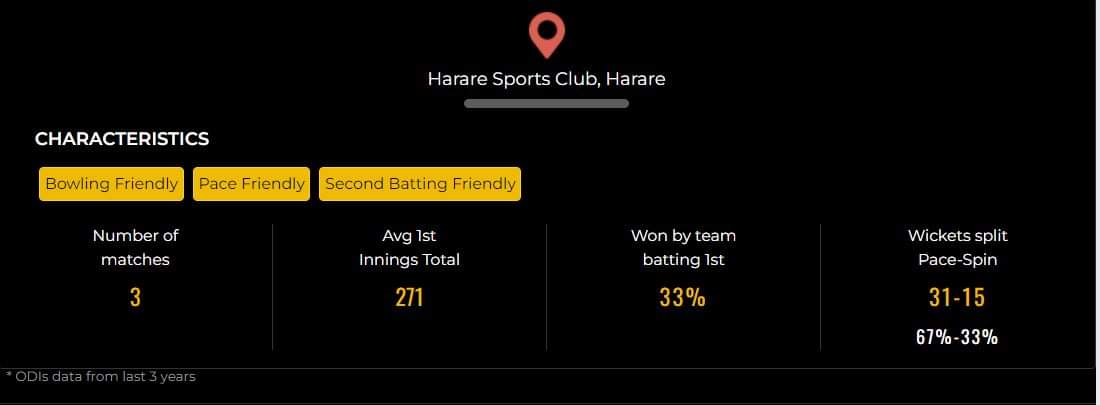 Since January 2018, Harare Sports Club has hosted 18 matches in which 7531 runs have been scored at a run rate of 4.7. A batting average of 26.6 with a balls per dismissal ratio of 33.6. Hence, one can easily conclude that this is not the easiest of surfaces to bat. 161 of the total 261 wickets that fell in the aforementioned time period went to pacers whereas spinners have had a share of 100 wickets. Naturally, pacers have had a better bowling average and bowling strike rate - 26.2 and 33 respectively - as compared to 31.8 and 41.8 by the spinners.