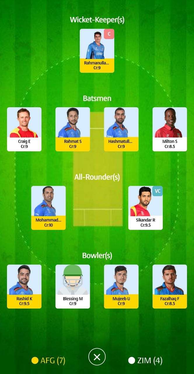 Afghanistan: Rahmanullah Gurbaz (wk), Ibrahim Zadran, Rahmat Shah, Hashmatullah Shahidi (c), Najibullah Zadran, Mohammad Nabi, Azmatullah Omarzai, Rashid Khan, Mujeeb Ur Rahman, Fazalhaq Farooqi, Fareed Ahmad Malik