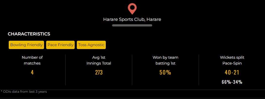 Unlike many venues around the world, Harare Sports Club hasn’t changed much in the last few years and nor have undergone any metamorphosis to accommodate a batting-friendly surface. Since January 2018, Harare Sports Club has hosted 19 matches in which 8023 runs have been scored at a run rate of 4.8. A batting average of 26.9 with a balls per dismissal ratio of 33.6. Hence, one can easily conclude that this is not the easiest of surfaces to bat. 169 of the total 275 wickets that fell in the aforementioned time period went to pacers whereas spinners have had a share of 106 wickets. Naturally, pacers have had a better bowling average and bowling strike rate - 26.2 and 33 respectively - as compared to 31.8 and 41.8 by the spinners.