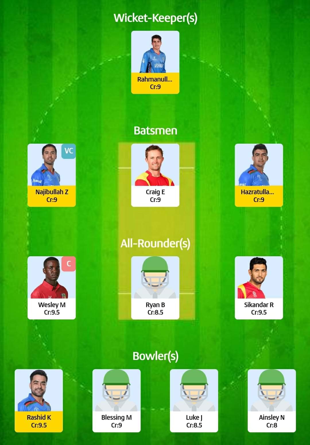 For Grand leagues: Wesley Madhevere (Captain), Najibullah Zadran (Vice-captain)
