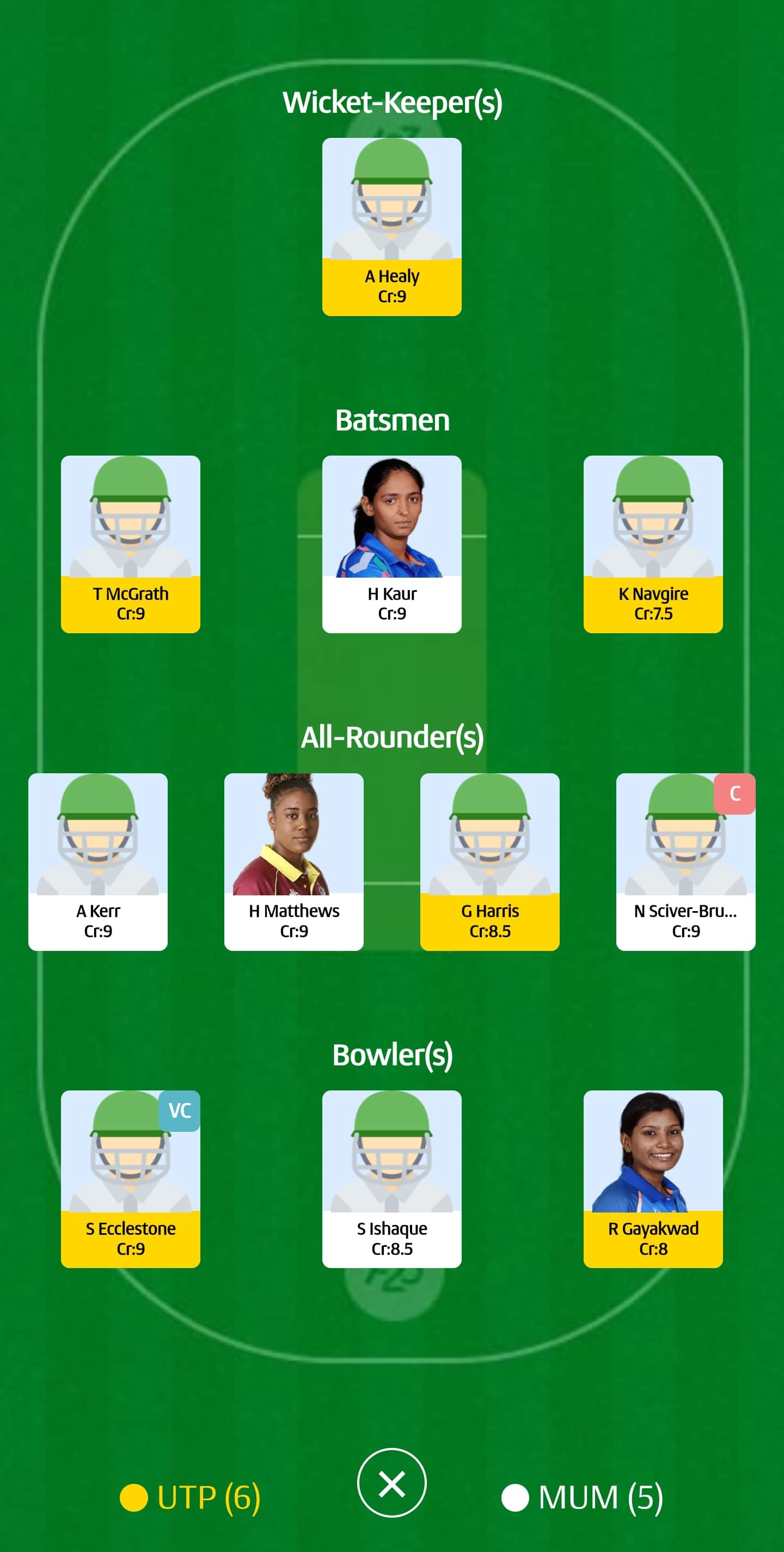 Mumbai XI: Yastika Bhatia (wk), Hayley Matthews, Nat Sciver-Brunt, Harmanpreet Kaur (c), Amelia Kerr, Isabelle Wong, Pooja Vastrakar, Humaira Kazi, Amanjot Kaur, Jintimani Kalita, Saika Ishaque