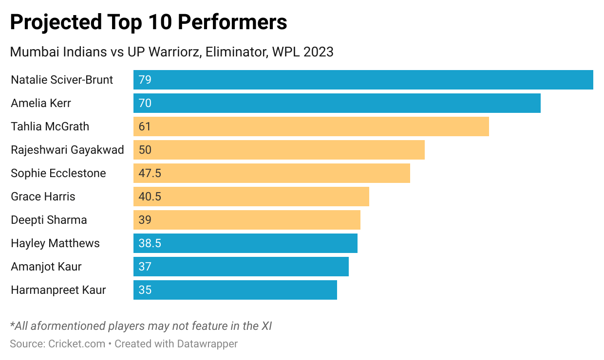- It is a battle of two of the best bowling units in the competition, with Mumbai Indians women having picked up the most wickets (59) followed by UP Warriorz, who have picked up 48 wickets. Will be interesting to see who will turn up better on the night.