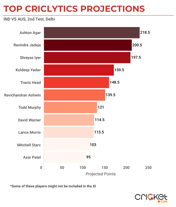 Off-spinners have the highest percentage of wickets at 36.6% while left-arm orthodox spinners have the best bowling average at 21.7. Thus, it will be tricky to tackle the three Indian spinners- Ravichandran Ashwin, Axar Patel and Ravindra Jadeja. Both Ashwin and Jadeja picked five-wicket hauls in the first Test. Hence, load your team with spinners and batters who play it well.