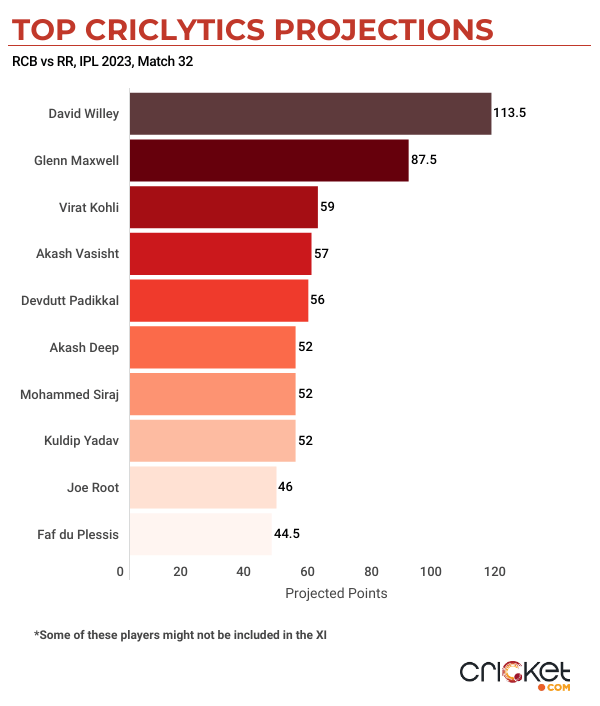 Glenn Maxwell is among four players in the IPL who has a strike-rate in excess of 195 among batters with at least 50 runs in IPL 2023. His strike-rate shoots up to 208.5 at the Chinnaswamy Stadium though. With plenty of left-handers in the RR line-up, including Yashasvi Jaiswal, Devdutt Padikkal and Shimron Hetmyer, Maxwell's off-spin could be more than a decent bowling option too. Against left-handers in the IPL since 2020, Maxwell has picked up nine wickets at an economy rate of 7.4.