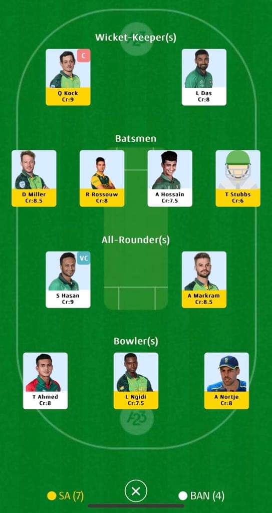 For grand leagues: Lungi Ngidi (Captain), Taskin Ahmed (vice-captain)