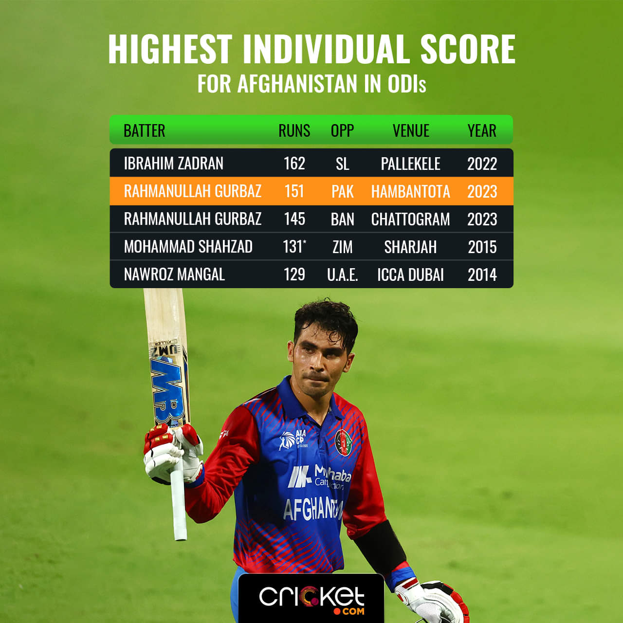 During his stay in the middle, Gurbaz slammed 14 fours and three maximums and became the first wicketkeeper-batter to touch the 150-run mark against Pakistan in ODIs. He also registered the second-highest individual score for Afghanistan, only behind Ibrahim Zadran’s 162 against Sri Lanka in 2022.