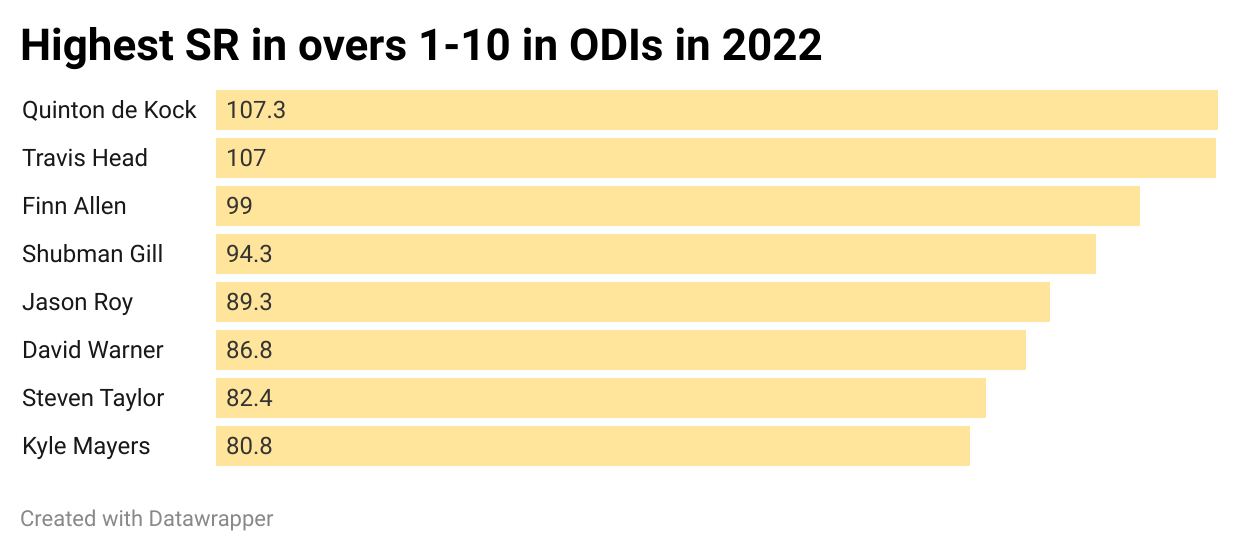The South Australian has opened the batting 6 times this year, and in those six occasions, in the first 10 overs, he’s smashed 169 runs at a strike rate of 107. In the entire world, among openers to have scored at least as many runs as Head in the first 10 overs, only Quinton de Kock has scored quicker.