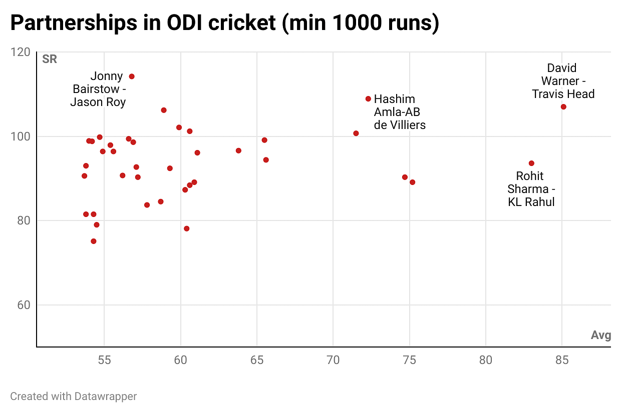 Head, as a package, compliments Warner perfectly and it is one of the primary reasons why these two have been close to invincible batting together as a pair. Warner and Head have now batted 13 times together in ODIs and have amassed 1106 runs at an average of 85.1 and strike rate of 107. As things stand, it is the best average for any pair in ODI history to have scored 1000 or more runs batting together.
