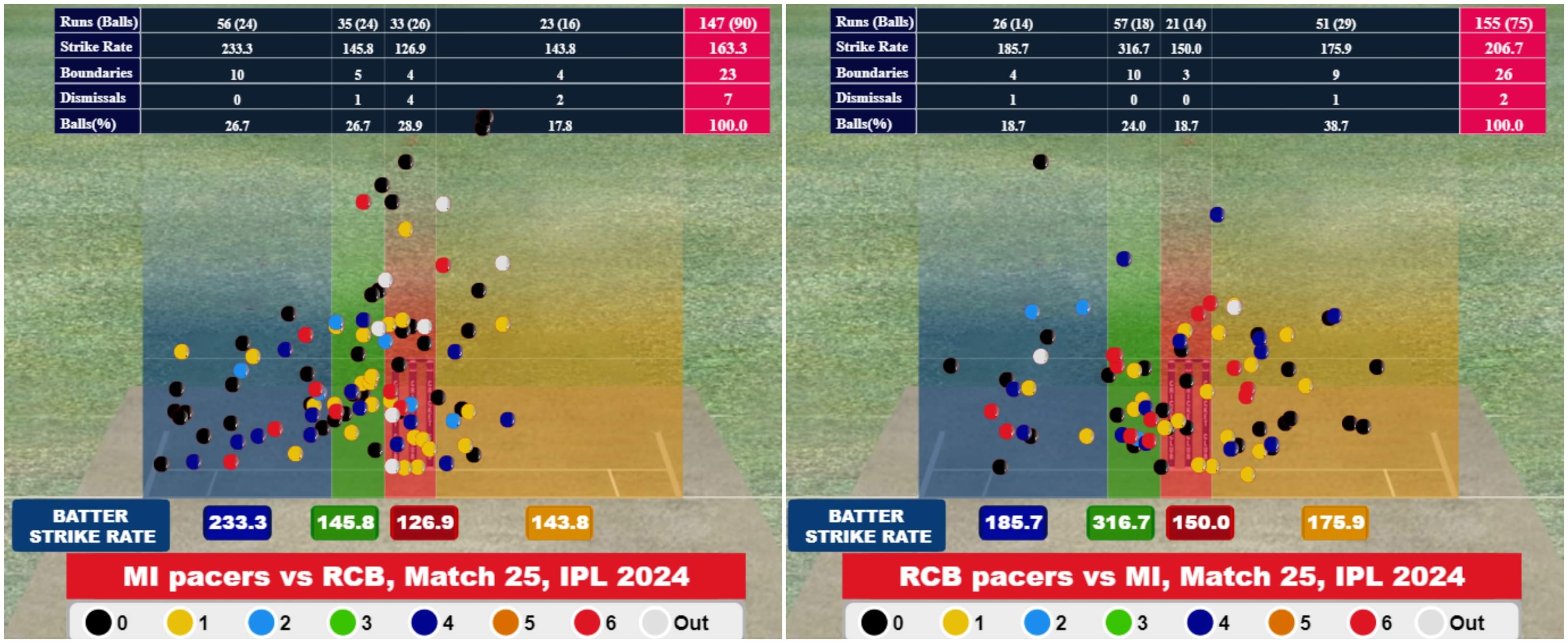 The beehive of both pace attacks above highlights the inaccuracy and control issues with RCB’s pace bowling. Their speedsters kept bowling full tosses and half trackers that were smacked for big shots by the likes of Kishan, SKY, Rohit, and Pandya. The result was 199 chased down in just 15.3 overs, as they also missed a quality spinner today.