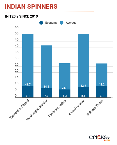 Chahal, Washington, Ravindra Jadeja, Krunal Pandya and Kuldeep Yadav are the only five spinners who have played more than one T20I since 2019. Krunal hasn't played a T20I since November 2019, while Kuldeep has fallen way off the radar when it comes to T20Is. Jadeja is currently injured, but he along with Washington have been two of India's most consistent spinners in this format. With Rahul Chahar, Varun Chakravarthy and Rahul Tewatia all waiting in the wings, Chahal needs to pull up his socks and start delivering.