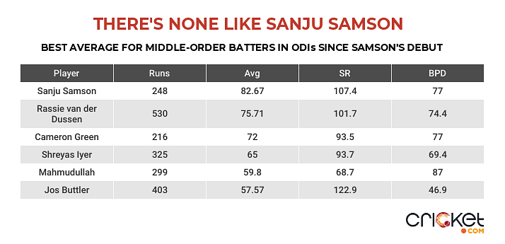 Truth be told, Samson has adapted to 50-over cricket like a duck to water. In his nine-innings ODI career, the right-hander averages a humongous 73.50, with a daunting strike-rate of 106.13. Since his debut, amongst the top ten nations, with a minimum of five innings, no middle-order batter averages more than Samson.