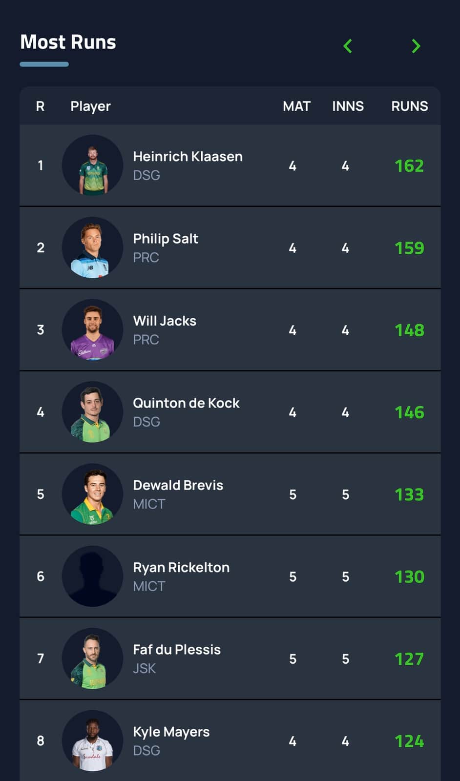 Top performers with the batWhile Klaasen, Jacks and Salt have been stand-outs, Buttler 117/39/121 (runs/avg/SR), Miller 79/26/138 and Markram 113/28/131 have all blown hot-and-cold and have struggled to dominate. Jason Roy 61/15/97 and Van der Dussen 56/19/100 have been proper duds.