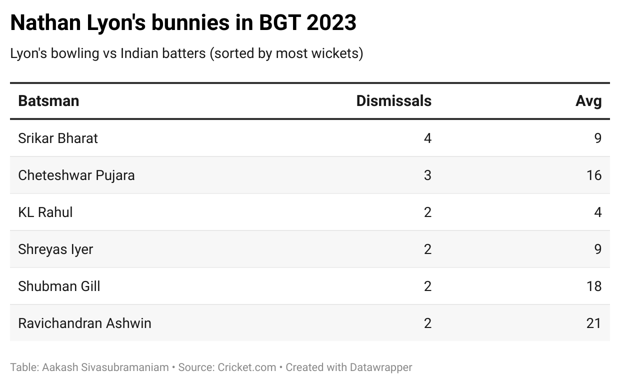 Additionally, no spinner has dismissed Pujara as many times as Lyon has (eight), the next best is Graeme Swann, thrice. Barring Kohli, Axar Patel and Shami, Lyon dismissed all the other Indian batters at least once in the series. To add to that, the likes of Gill, Iyer, Bharat all averaged less than 20 against the off-spinner, showing why he stands a class apart.