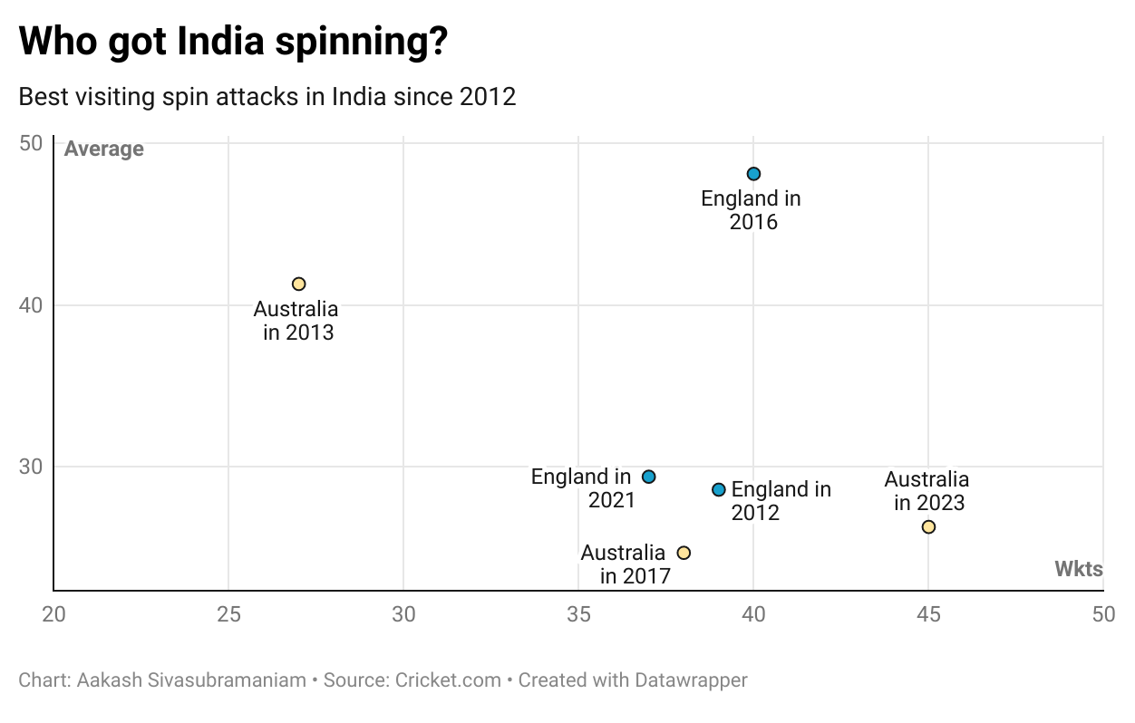 Since 2012, including the famous English spin duo, Australian spinners have fared the best in India, with an average of 29.4. In 2013 the Australian spinners picked up 27 and this figure rose to 38 in 2017 but to pick up 45 wickets, which they did in 2023, is some feat.