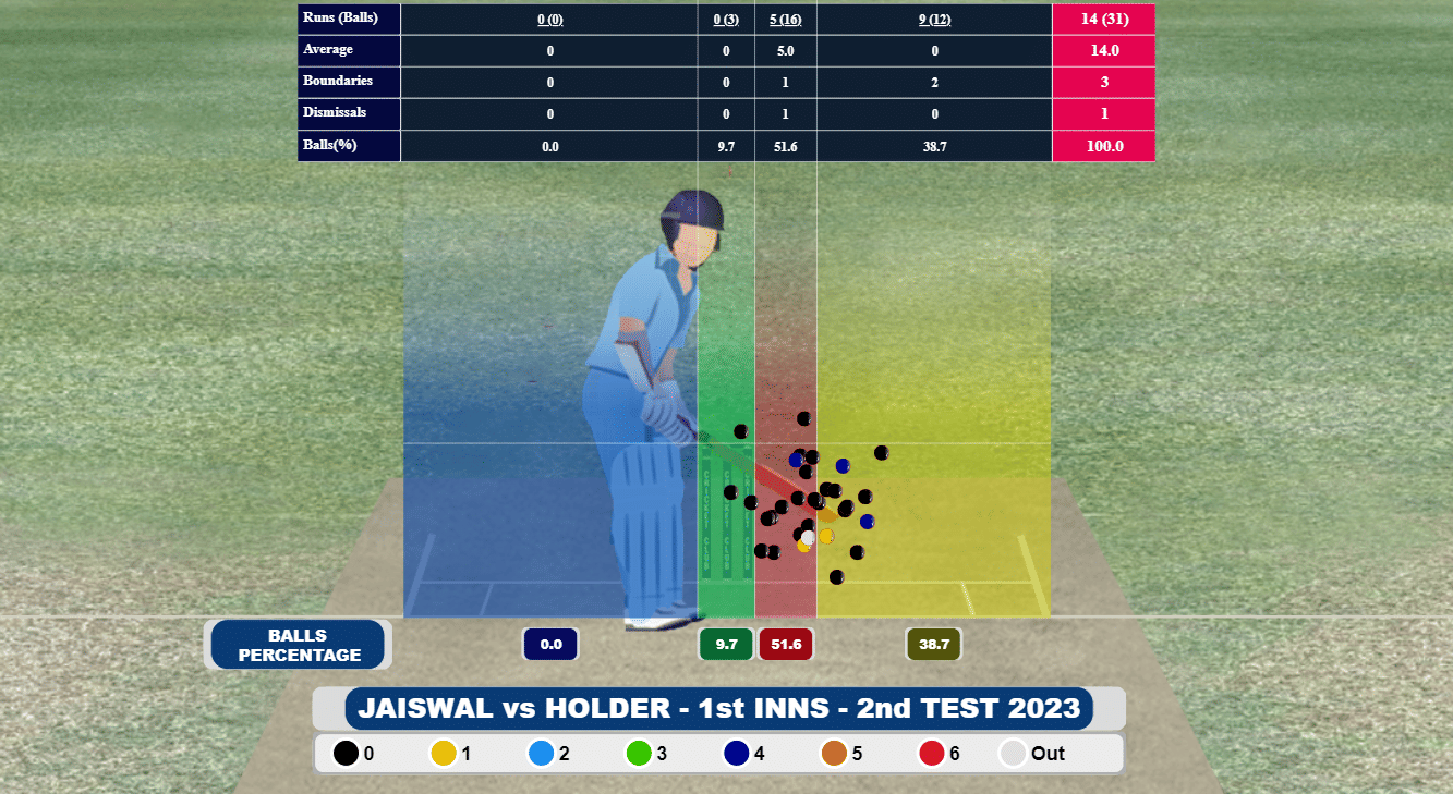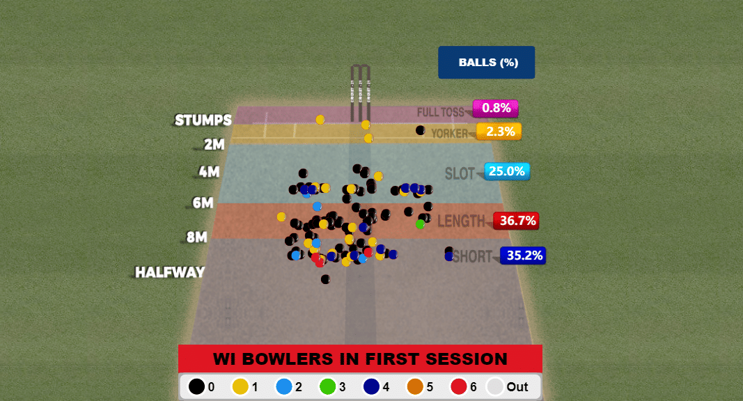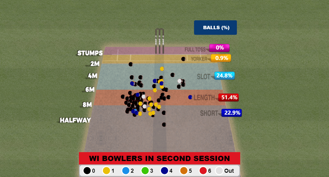 Jaiswal’s dismissal early on in the second session meant that they had to bowl to four RHBs one after the other. This helped them hit the hard lengths a lot more consistently. And is reflected in their returns. Post Jaiswal’s dismissal, there was a phase in play when West Indies came back in strongly, taking three wickets for 16 runs.