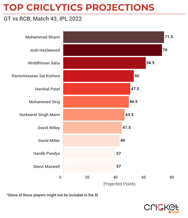 Criclytics predicts Shami to pick 2-3 wickets against RCB.