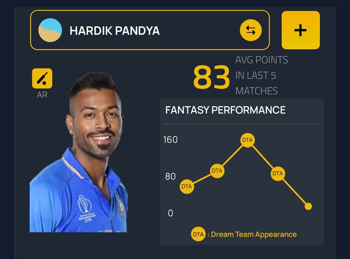Criclytics predicts Hardik to score 16-24 runs and pick up 0-1 wicket against RCB.