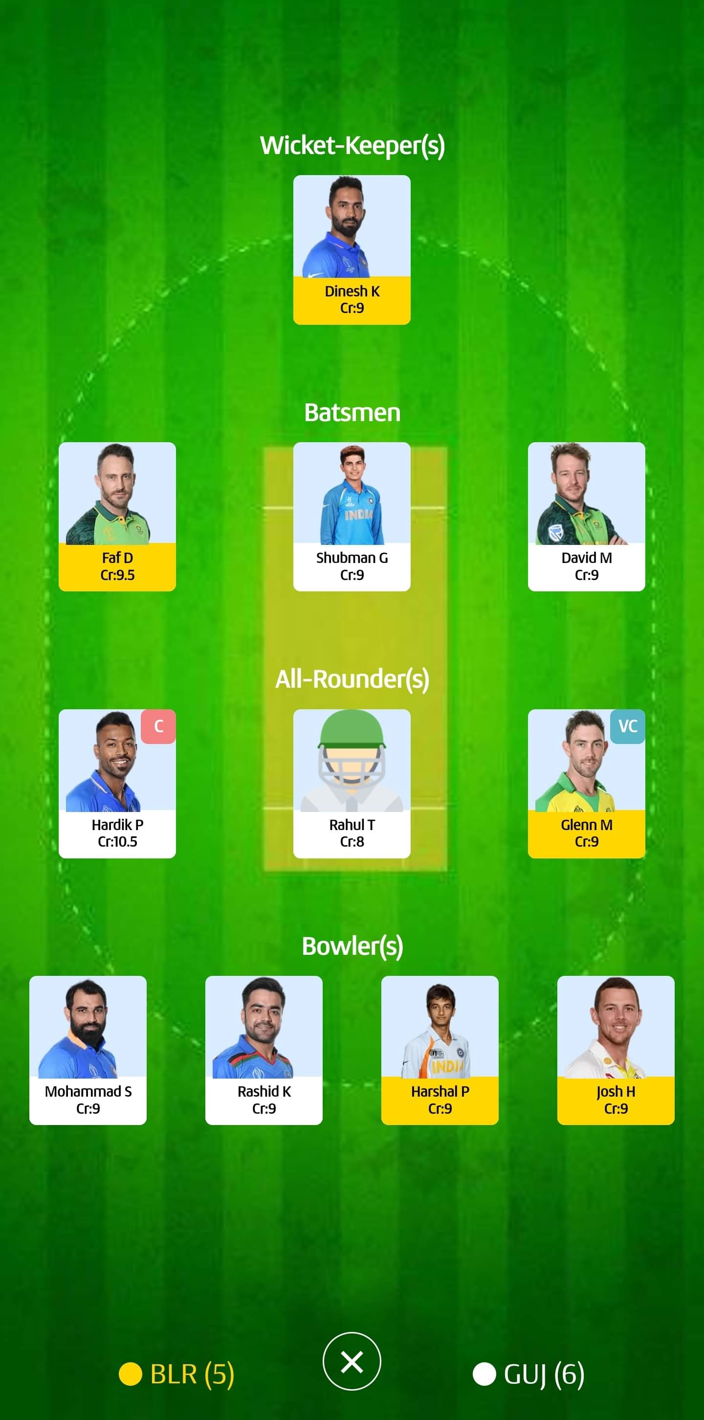 Royal Challengers Bangalore: Faf du Plessis (c), Rajat Patidar/Mahipal Lomror, Virat Kohli, Glenn Maxwell, Suyash Prabhudessai, Shahbaz Ahmed, Dinesh Karthik (wk), Harshal Patel, Wanindu Hasaranga, Josh Hazlewood, Mohammad Siraj