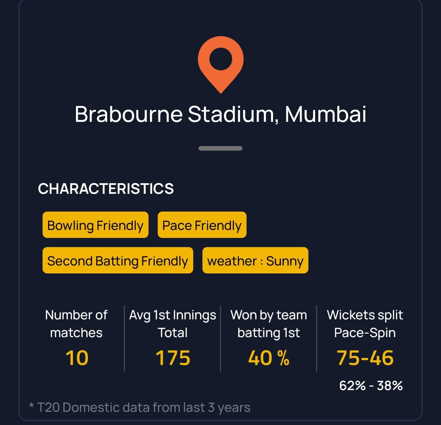 Gujarat and Bangalore clash at the Brabourne Stadium, one of the relatively high-scoring venue in the competition. Only 40% of the games have been won by sides batting first, which yet again means that winning skipper is most likely to chase. However, it is a day encounter, which might just put the two captains – Hardik Pandya and Faf du Plessis – in a dilemma.