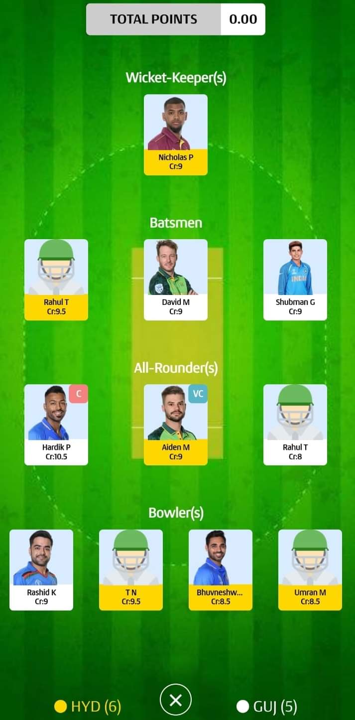 Gujarat Titans: Wriddhiman Saha (wk), Shubman Gill, Hardik Pandya (c), Abhinav Manohar, David Miller, Rahul Tewatia, Rashid Khan, Alzarri Joseph, Lockie Ferguson, Yash Dayal, Mohammed Shami