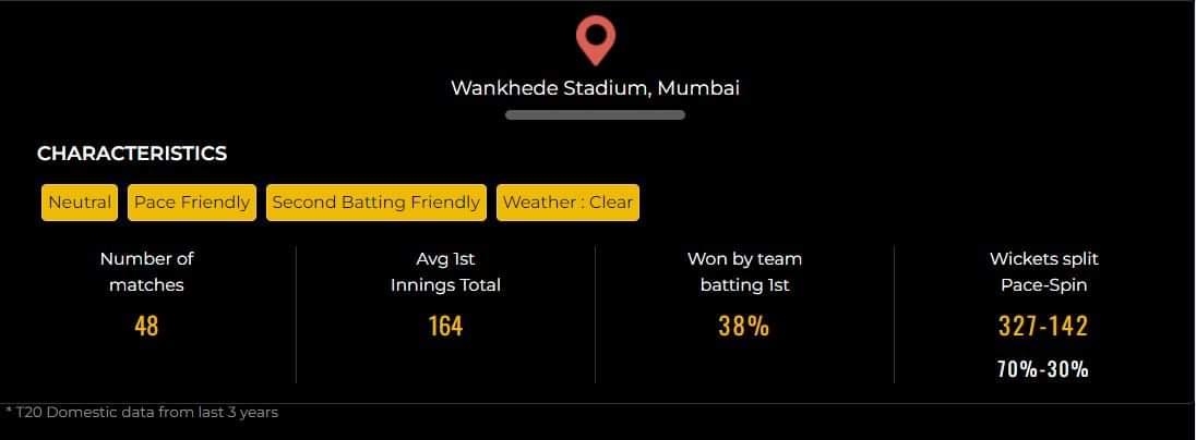 The venue has been a batting paradise for a while now and since 2019, the average first innings score at the Wankhede Stadium is 171/6 with the average first innings win score being 194/5. In 52 matches since 2019, batting first teams have won 22 whereas the chasing teams have secured 30 wins. Pacers have understandably had a better impact at the venue in T20s, with an average of 29.1 as compared to spinners’ average of 35.