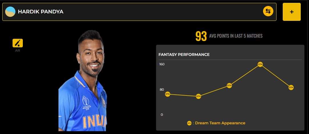 Our Criclytics Player Projection predicts Hardik to score 16-24 runs in this match and pick 0-1 wickets