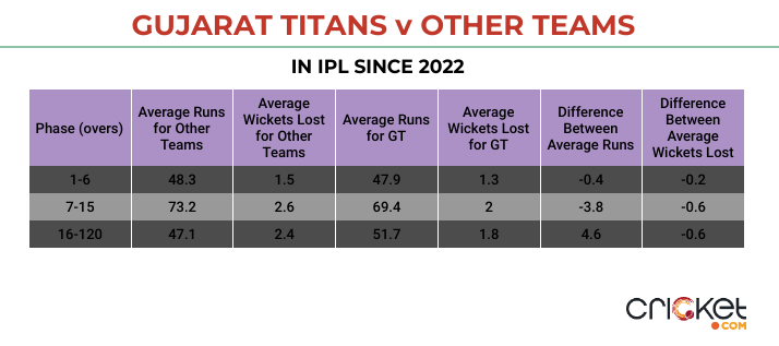 The aforementioned graphic will tell you how they approach their batting. If you compare their numbers with the other nine teams, Gujarat have scored lesser runs in the first two phases but have also lost fewer wickets. And, that has allowed them to dominate the death overs. Their average runs (51.7) scored in this phase is 4.6 higher than the other teams (47.1).