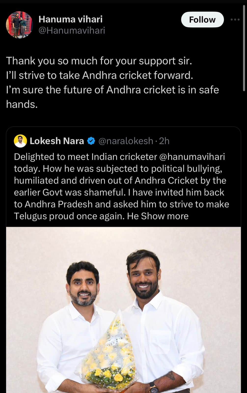 Vihari’s tweet was in response to the original tweet from Nara Lokesh which said: “Delighted to meet Indian cricketer @hanumavihari today. How he was subjected to political bullying, humiliated and driven out of Andhra Cricket by the earlier Govt was shameful. I have invited him back to Andhra Pradesh and asked him to strive to make Telugus proud once again. He will have our full support.”