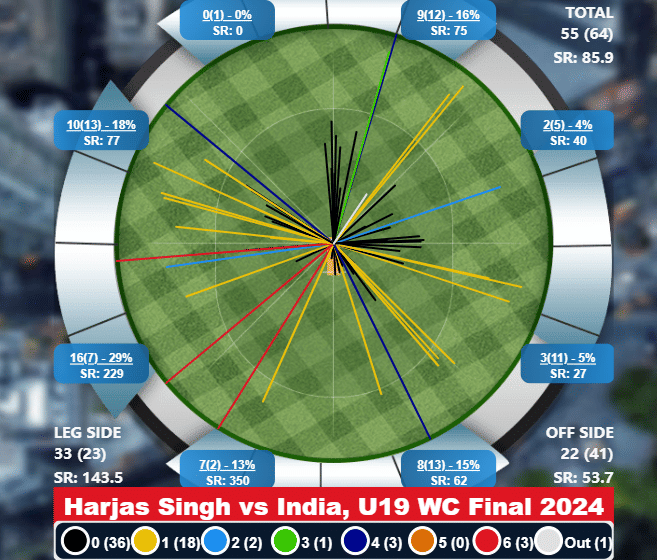 That was easily the most confident shot he has played in the tournament so far. It opened the floodgates for him. In the next 43 balls that he stayed at the crease, he scored 49 runs. Most of those runs came against the spinners, as Harjas displayed his natural power down the ground with his slog sleeps.