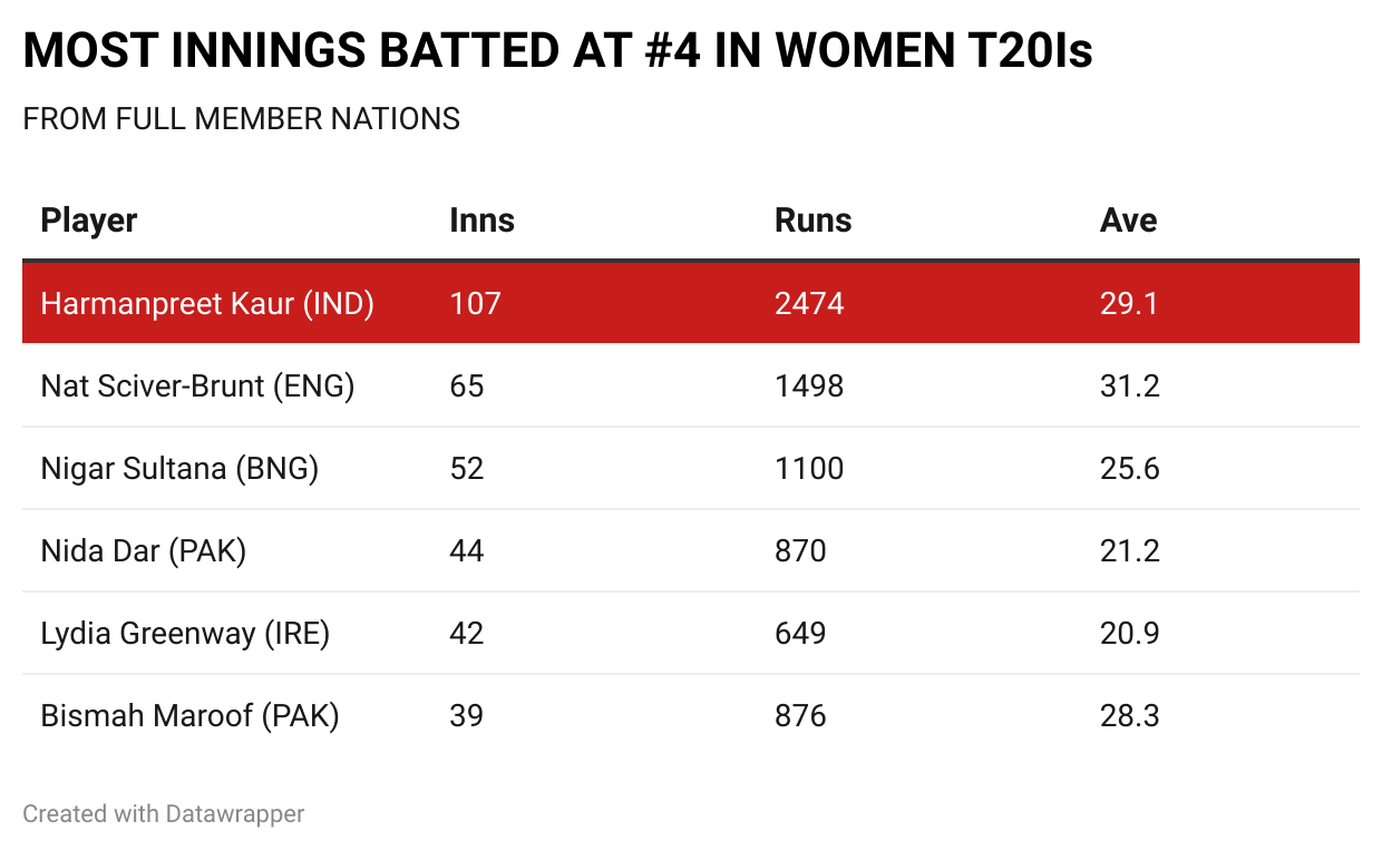 India have a batting lineup without a defined number three but a powerful middle-order with Jemimah Rodrigues and Richa Ghosh in form. Harman will be the link between them at number four, arguably the trickiest position to bat in T20Is. She has batted 107 innings at that position with no one else doing it even 70 times.