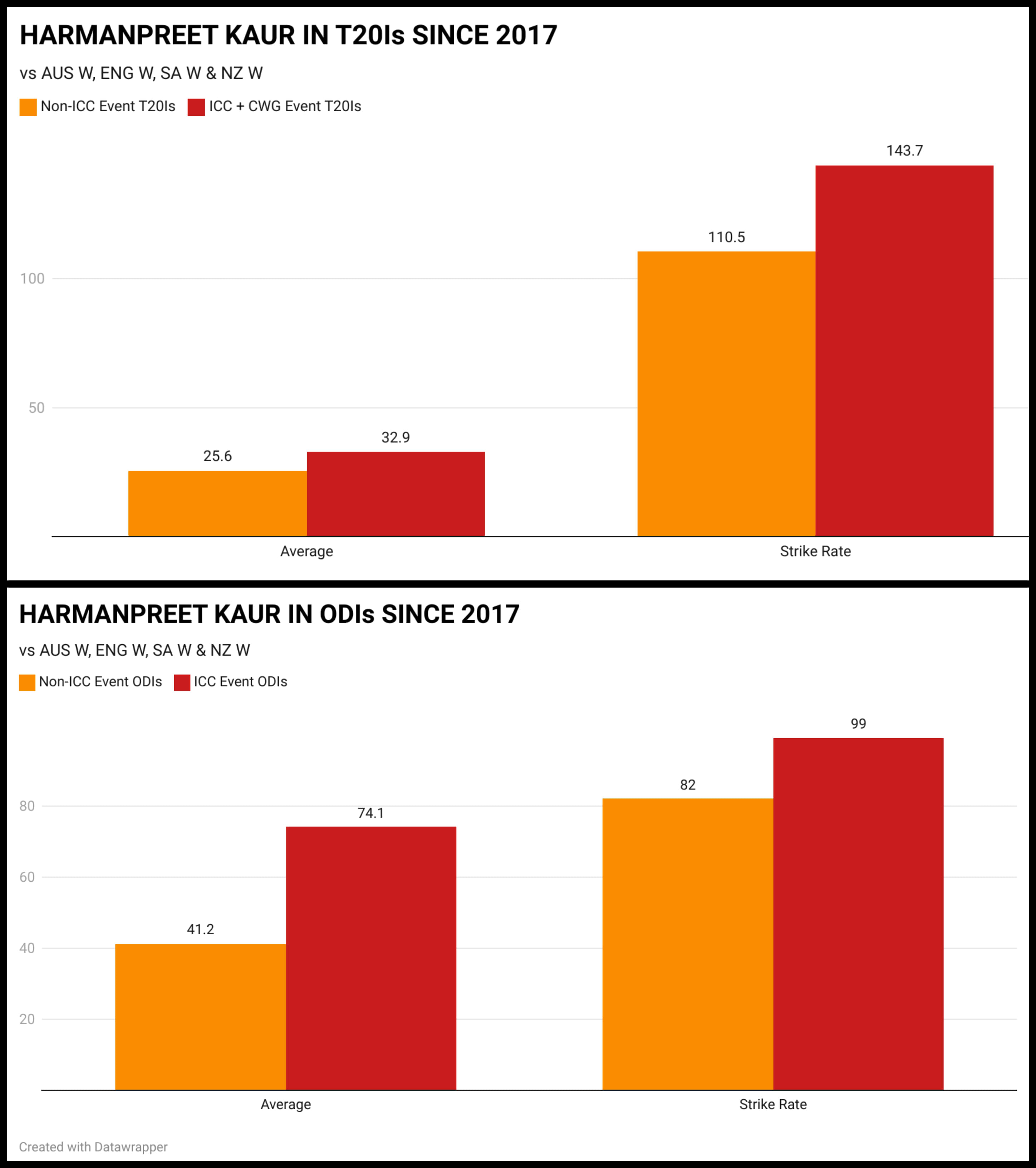 The right-hander has carved her career out of stepping up on big occasions. She has decent numbers against the big women’s cricket players — Australia, England, South Africa and New Zealand. However, she becomes a different beast facing them in ICC events.
