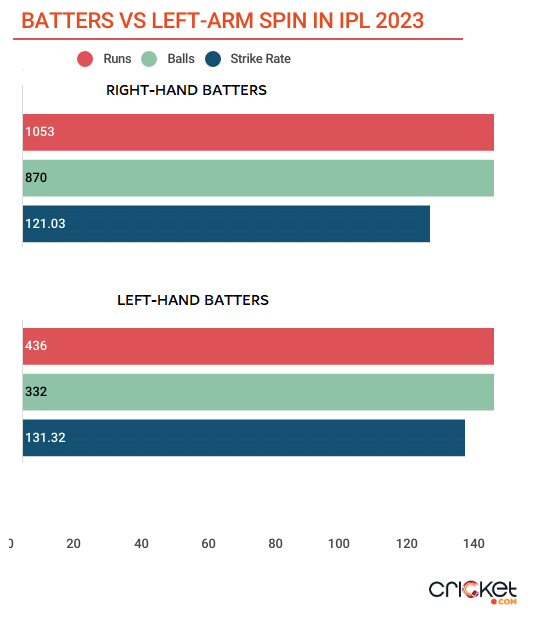 This year, left-hand batters have scored at a SR of 131.3 against left-arm spinners, hitting a six every 15.09 balls. In contrast, right-handers have only managed to score against left-arm spinners at a SR of 121.03, hitting a six every 18.12 balls. (Among players who have batted in the Top six).